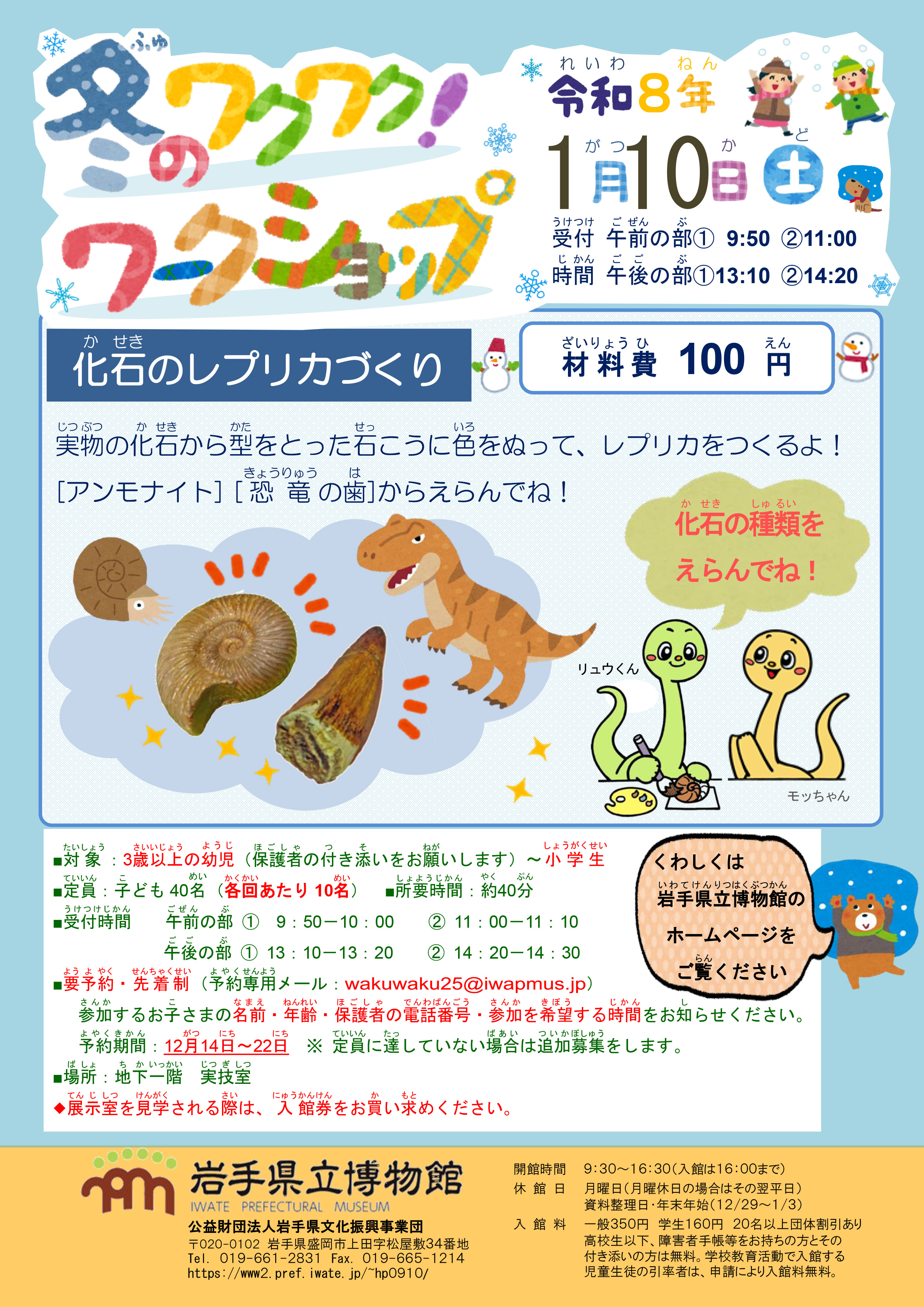 令和8年1月10日(土)に、冬のワクワク!ワークショップ「化石のレプリカづくり」を開催します。