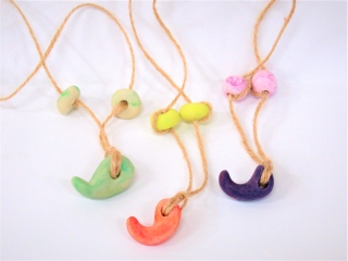 「まが玉アクセサリー」:樹脂粘土に色をつけてまが玉を作り、ひもに通してネックレスにします。