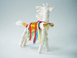「チャグチャグ馬コづくり」:紙ひもで編んだ馬に、千代紙などで飾りつけをします。