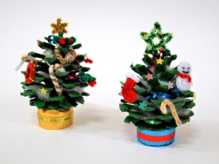 「松ぼっくりのXmasツリー」:松ぼっくりをツリーに見立て、モール、リボン等で飾り、クリスマスツリーをつくります。