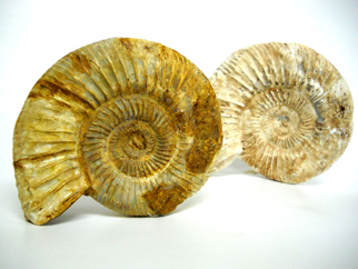 「化石のレプリカ」:実物の化石から型をとった石膏にアクリル絵の具で彩色してレプリカをつくります。
