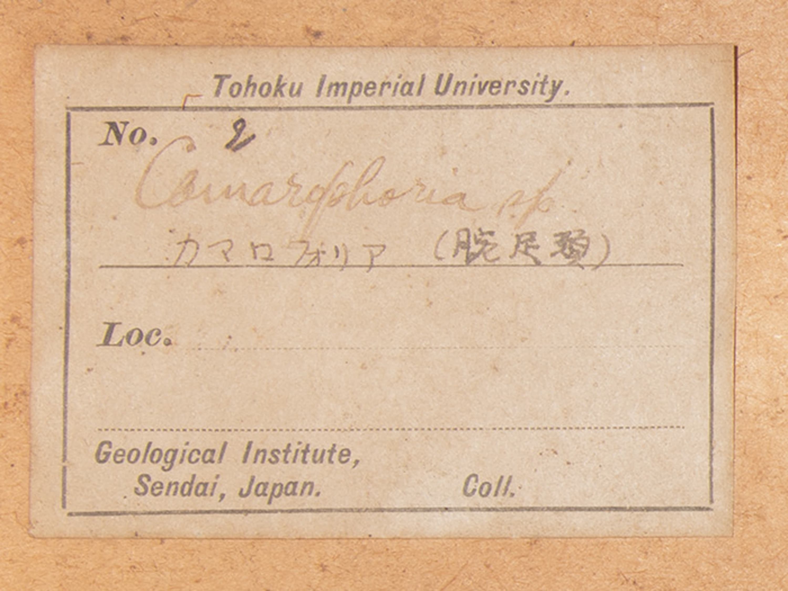 この標本は、旧陸前高田市立矢作小学校に長年保管されていたもので、1918(大正7)年に東北帝国大学(当時)の早坂一郎氏と博物学者の鳥羽源蔵氏によって鑑定された標本と見られ、当時書かれた標本ラベルも残っています。※学名は現在の古生物学の知見からは再考が必要なものもありますが、標本の性質上、当時のラベルのまま表記しています。